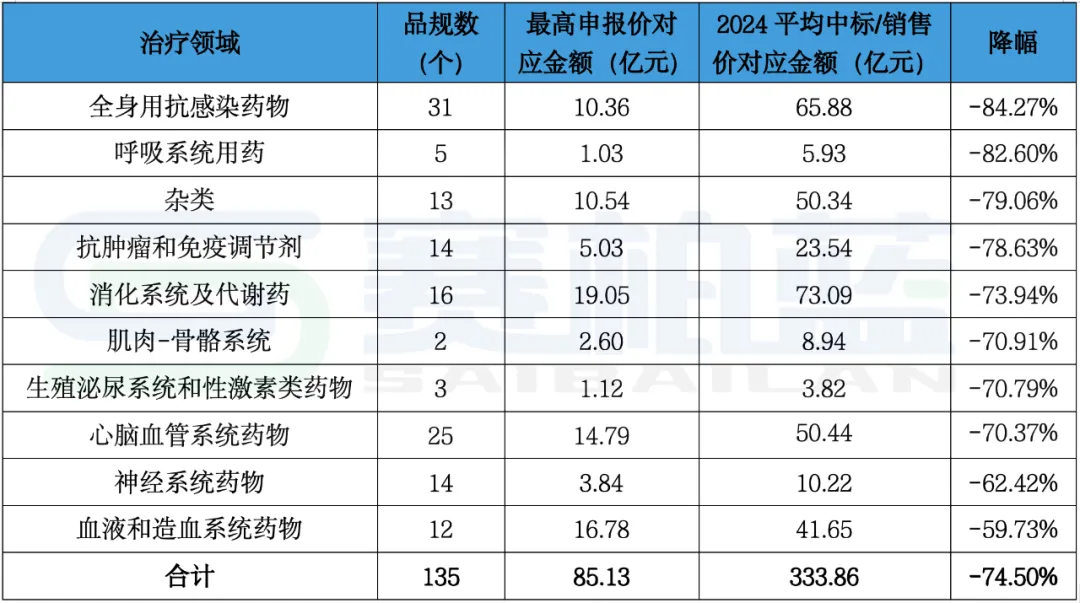 分具体治疗领域来看,有全身用抗感染药物和呼吸系统两个治疗领域的分别31个品规、5个品规对应的降幅在80%以上,其它的如以造影剂为主的杂类、抗肿瘤和免疫调节剂、以糖尿病为主的消化及代谢药总体降幅也在70%以上,降幅最低的以阿司匹林为代表的血液和造血系统药物总体降幅也接近60%。