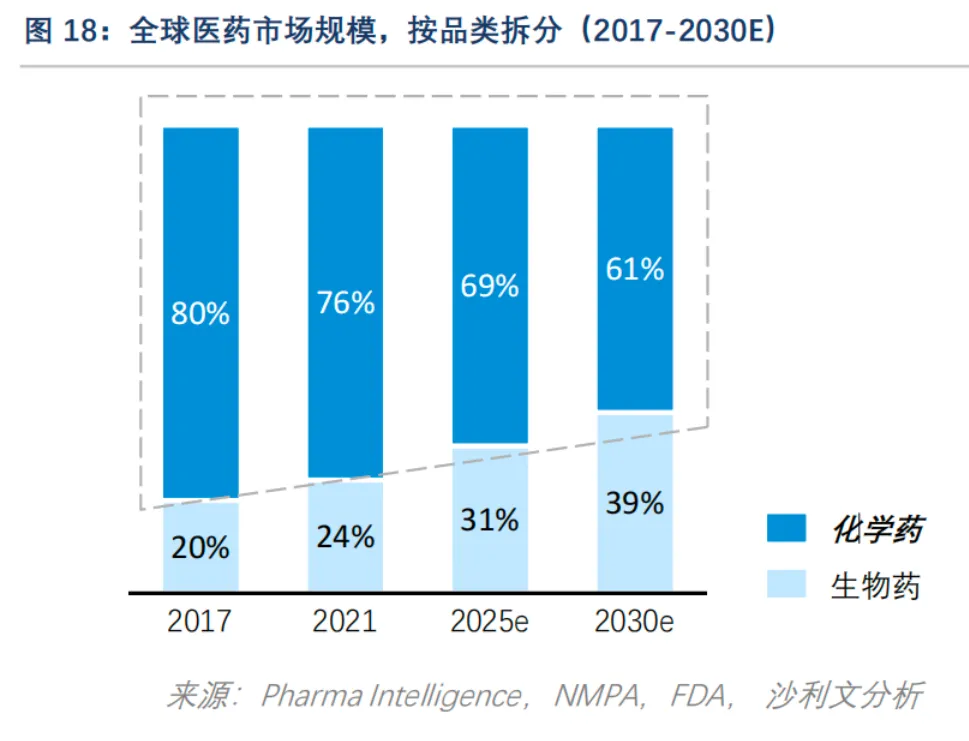 而从整个CDMO市场的业务占比来看,大分子CXO由于还处于做大蛋糕的阶段,因此未来,大分子CXO业务占整个市场CXO业务比重不断提升是完全在预期之内的。同样根据《CDMO行业发展现状及趋势》,2021年生物药占全球医药市场规模比重是24%,到2025年将超过30%达到31%,到2030年,这个数字将会接近40%。