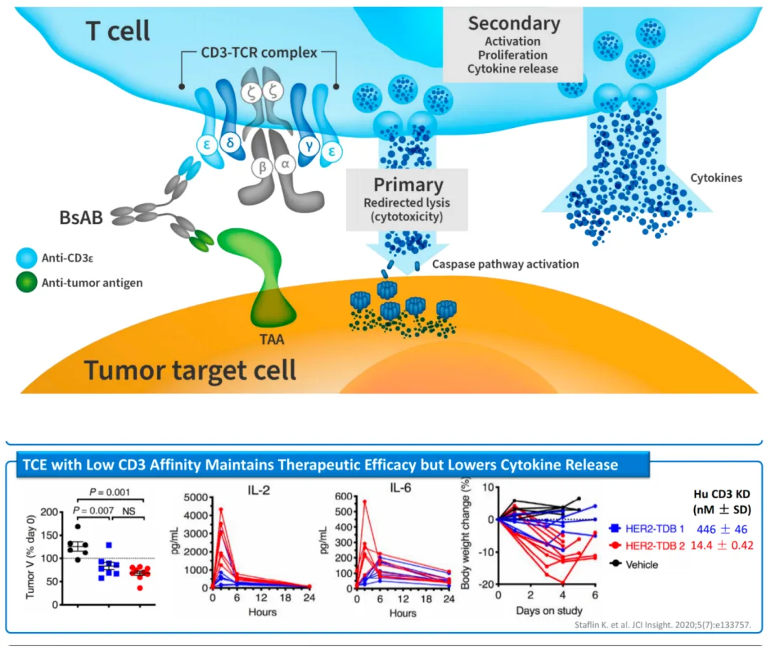 众所周知,TCE单抗中的重要组成部分之一是CD3抗体,其用于结合T细胞,但这是一把双刃剑,如果处理不当,将会使得引起人体内的CRS(细胞因子释放综合征)。而根据药明生物的公开资料,其在该问题上的核心思路是弱化CD3抗体的亲和力,以此来减少T细胞的“过度反应”,这使得其在安全性之上做到了质的提升。