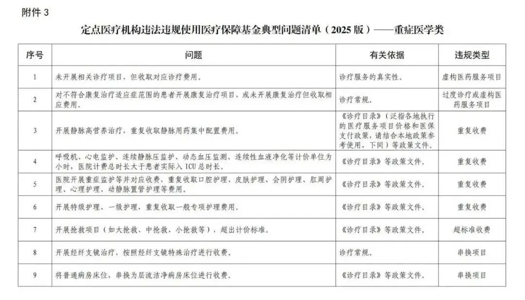 3、定点医疗机构违法违规使用医疗保障基金典型问题清单(2025版)——重症医学类