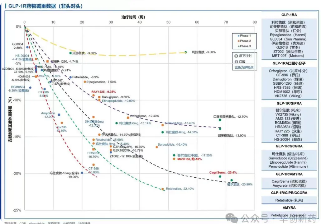 该数据放在双靶点中是相当具有竞争力的。效果如何?可以参照下图华创研究所医药组绘制的GLP-1类型减重药物的减重百分比-时间坐标图对照。以上月公布的安进的GLP-1激动/GIPR拮抗药物AMG133为例,其II期临床数据来看,经过52周治疗后,减重约18%(亚组方面,280mg剂量组减重20%)。