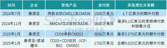 1月20日,康诺亚与诺诚健华合作的一款CD20×CD3双抗再度以Newco的模式达成对外授权交易,对价部分包括1750万元的首付款加上未来最高5.025亿美元的额外付款。