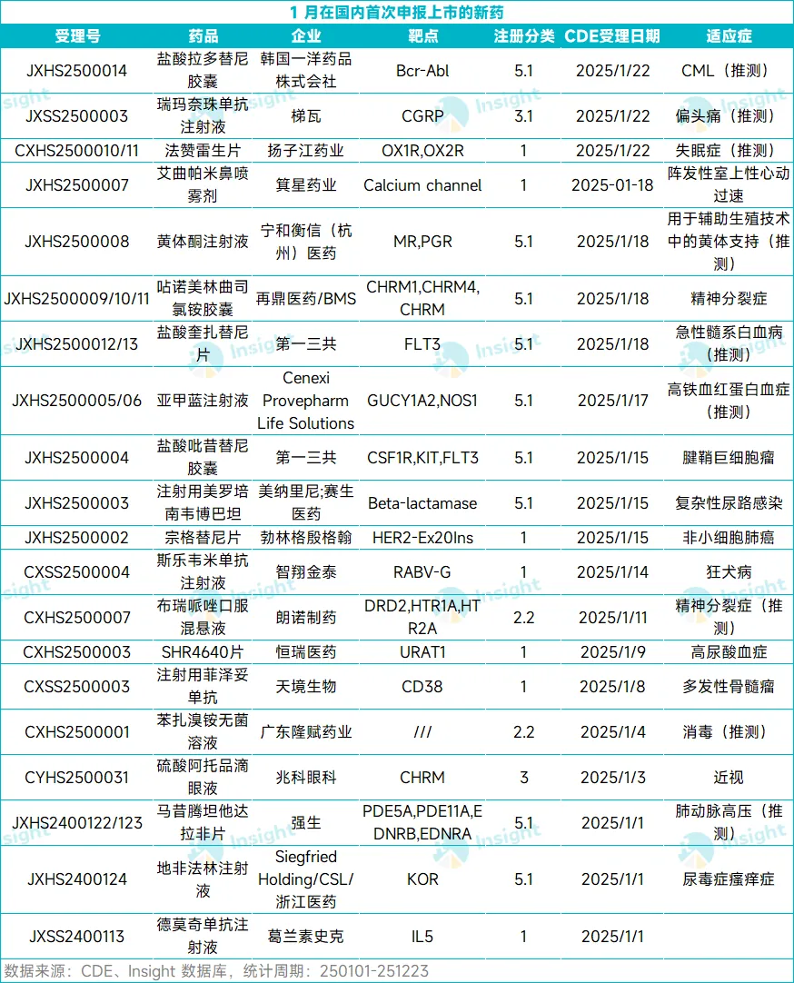 1 月 15 日,第一三共的 5.1 类新药吡昔替尼上市申请获得 CDE 受理。吡昔替尼此前已被 CDE 纳入优先审评,用于治疗伴有重度病变或功能受限且无法通过手术改善的症状性腱鞘巨细胞瘤(TGCT)成年患者。Insight 数据库显示,吡昔替尼此前已在美国获批,是全球首个也是迄今唯一获批治疗 TGCT 的药物。