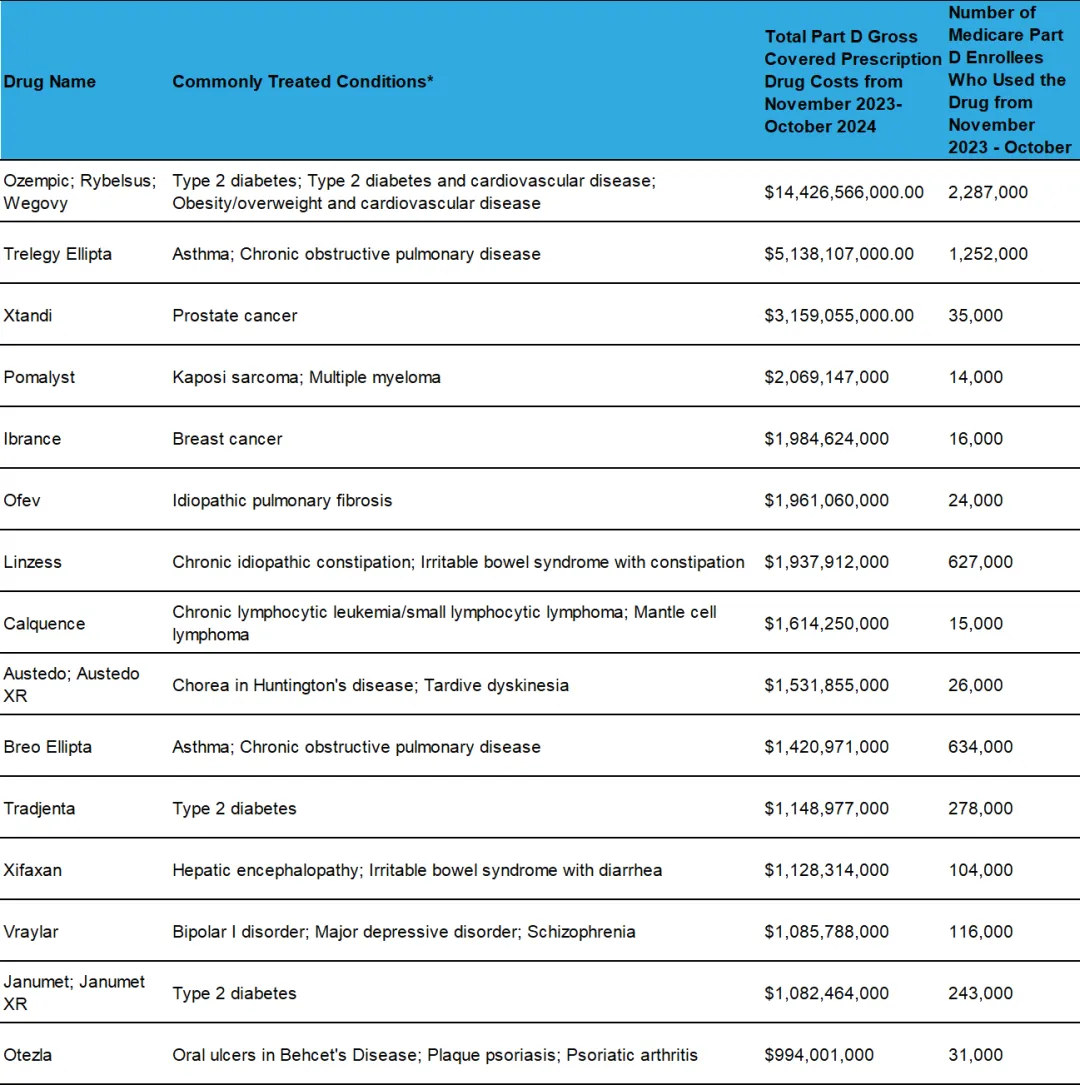 根据CMS发布的简报,2023年11月到2024年10月期间,联邦医保(D)总共为这15种药物花费了410亿美元,占政府医保计划承保处方药总成本的14%。