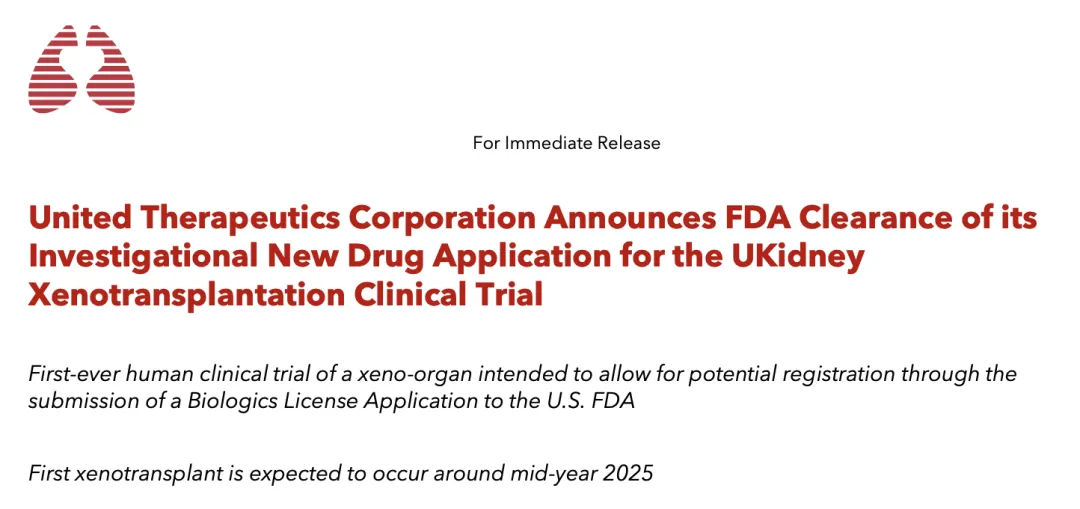 2 月 4 日,美国生物科技公司 United Therapeutics 宣布,美国 FDA 已批准其启动一项检验该公司异种肾脏 UKidney 移植的临床研究,该研究首次对异种器官进行人体临床试验,United Therapeutics 公司预计该试验中的首例异种移植将于 2025 年中进行。[1]