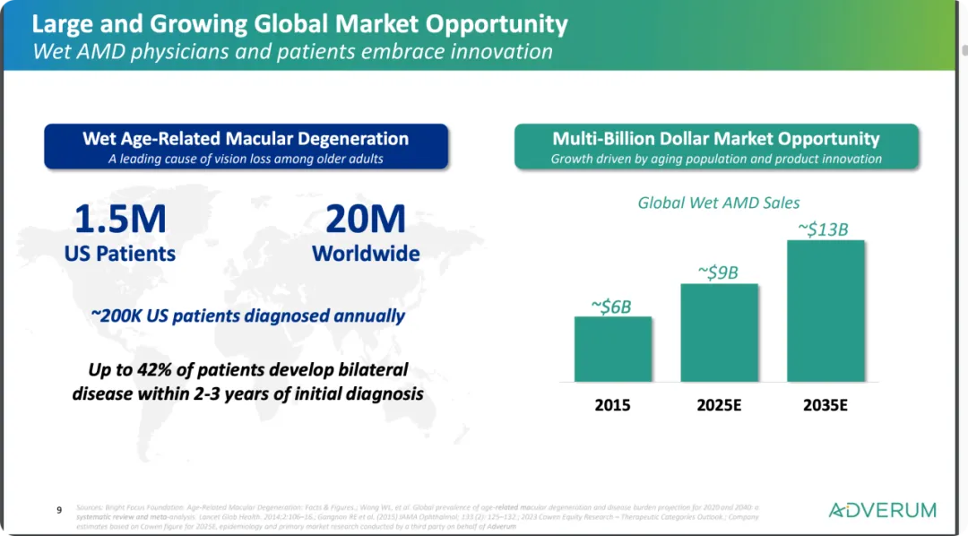 这里根据ADVERUM官网PPT的数据,光是wet-AMD单个眼科适应症,患者数量上美国就有150万名,而世界范围内有200万名。在市场方面,2025年市场为90个亿美元左右,预计2035年将会发展到130个亿美元。