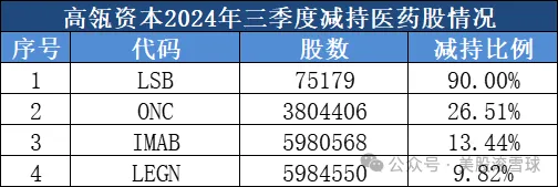 减持仓位方面,四季度,高瓴资本减持了四只医药股,与上季度数量相同。
