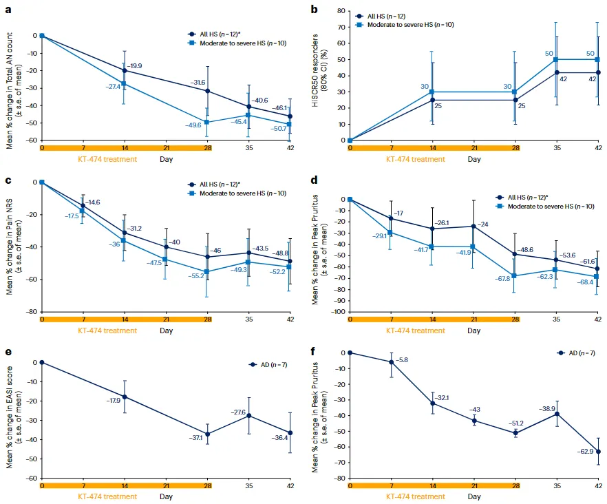 I期临床试验(NCT04772885)的结果初步证实,KT-474在治疗炎症性皮肤疾病方面具有潜力,标志着蛋白降解领域向非肿瘤疾病的扩展迈出了重要一步。另外,针对HS和AD的KT-474的II期临床试验也正在进行中。