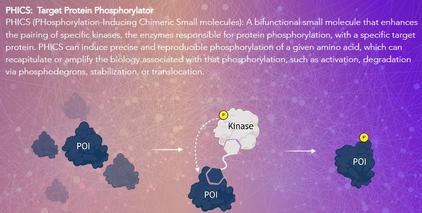 该论文阐述了一种名为磷酸化诱导嵌合小分子药物(PHICS)的新技术,其与PROTAC技术相似,均通过诱导接近原理发挥作用,但PHICS通过连接激酶配体(而不是PROTAC中的E3连接酶配体)与靶蛋白配体,促进特定激酶对靶蛋白的磷酸化,从而修复功能失调的蛋白,满足特定疾病的治疗需求。