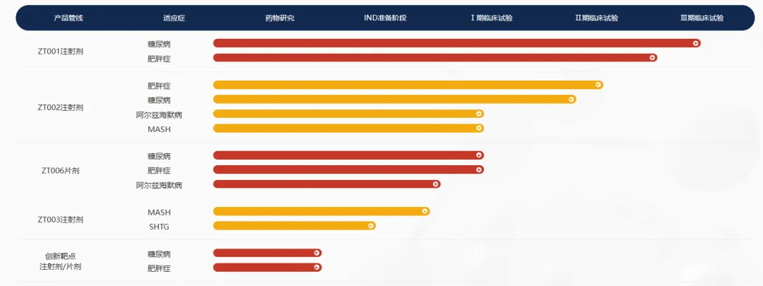 目前,质肽生物的产品管线包括具有差异化创新的重组蛋白药和生物类似药,覆盖糖尿病、肥胖症、阿尔茨海默病、MASH 等治疗领域。其中,进度最快的司美格鲁肽注射液 ZT001 已进入 Ⅲ 期临床,这是一种长效 GLP-1 受体激动剂。另外还有新型超长效 GLP-1 受体激动剂 ZT002 和新一代口服 GLP-1 多肽 ZT006 已进入临床阶段。