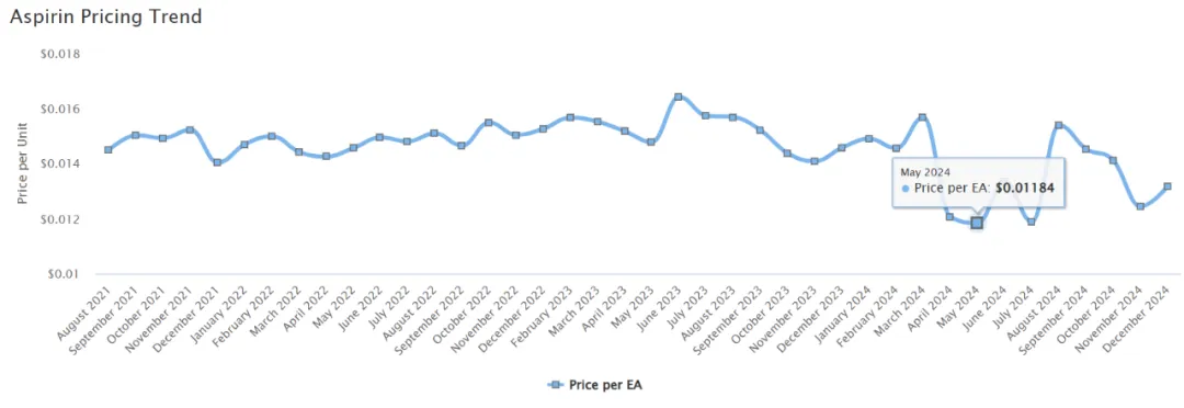 笔者检索了美国市场医疗保险和医疗补助服务中心(CMS)针对零售和连锁药店的月度调查,阿司匹林肠溶片(81mg,NDC 49348-981-15)的价格与趋势[1],如下图。