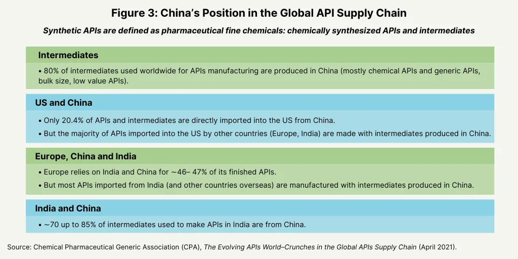 全球用于 API 制造的中间体中约有 80% 在中国生产(主要是化学 API 和仿制药 API)。对于某些抗生素,如头孢菌素、阿奇霉素和青霉素的 API,中国全球市场份额可以达到 90-95%。中国是美国和欧洲等发达市场的主要中间体供应国,也是印度的主要中间体供应国,见下图[3]。