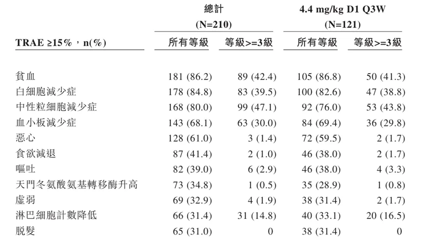 安全性方面,I期初步研究的结果表明,BL-B01D1常见的治疗相关不良事件(TRAE>10%,所有级别≥3级)包括白细胞减少症、 贫血、中性粒细胞减少症、血小板减少症、恶心、虚弱、食欲减退、脱发、呕吐等。所报告的大多数TRAE为轻度至中度,可通过支持治疗或剂量调整得到有效控制。
