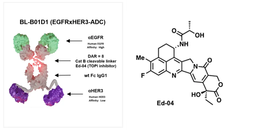 在结构设计方面,BL-B01D1同样巧妙。两个靶点的抗体采用了差异化的亲和力设计,以提高其偏向性的结合能力,同时Fc区域采用的野生性的igG1,通过Fc的效应细胞改善药物分布以及提高免疫反应。ADC设计方面,此在采用自主开发的拓扑异构酶毒素Ed-04,在第一三共的Dxd的α亚酰氨处进行了改进,连接子采用GGFG,DAR值为8。