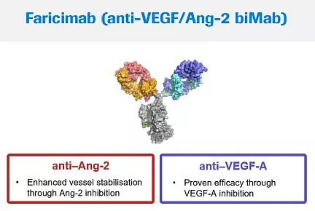 Vabysmo (Faricimab)是由罗氏开发的第一个获批用于眼部疾病的双特异性抗体,作用于血管生成素-2(Ang-2)和血管内皮生长因子-A(VEGF-A),Ang-2和VEGF-A通过破坏血管稳定、导致新的渗漏血管形成和增加炎症,从而导致视力丧失。