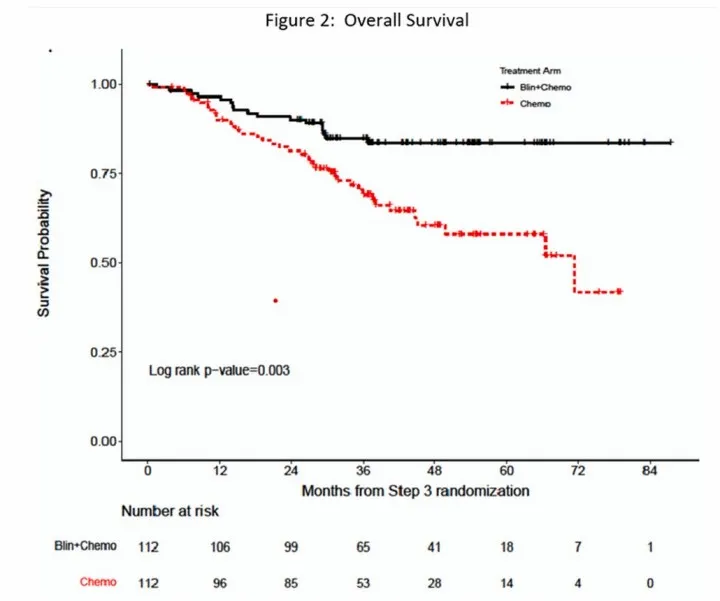 研究结果表明,与单纯化疗相比,Blincyto加入多期巩固化疗显示出更好的OS。Blincyto联合化疗组 (n=112) 的3年OS为84.8%,化疗组 (n=112) 的 3 年OS为69%,OS风险比为0.42。中位随访期为4.5年,Blincyto联合化疗组的5年OS为82.4%,化疗组为62.5%。