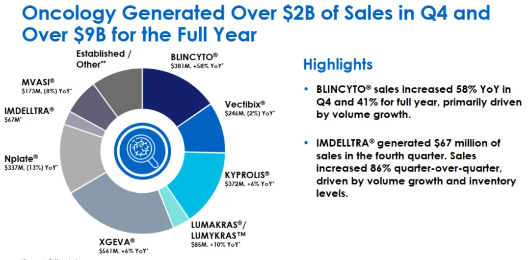 Blincyto自上市后销售额稳步增长,2021年达到4.72亿美元,然后可能由于Blincyto半衰期仅 2 小时,患者需要频繁给药,以及其它药物的竞争导致销售额在2022年下滑至3.36亿美元,不过由于BB-ALL患者的广泛处方销售额得到剧增,2023年Blincyto销售额达到8.61亿美元,2024年第四季度销售额为3.81亿美元,全年销售额达到15.9亿美元(图9)。