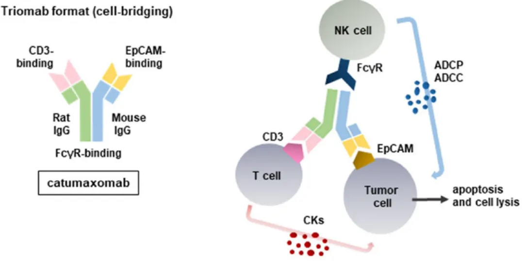 卡妥索单抗是首个获批的靶向CD3和EpCAM的双特异性抗体,是一种三单抗(Triomab)形式,它具有两个特异性抗原结合位点和一个功能性Fc结构域,能够同时靶向肿瘤细胞上的上皮细胞黏附分子(EpCAM)和T细胞上的CD3分子(图10)。