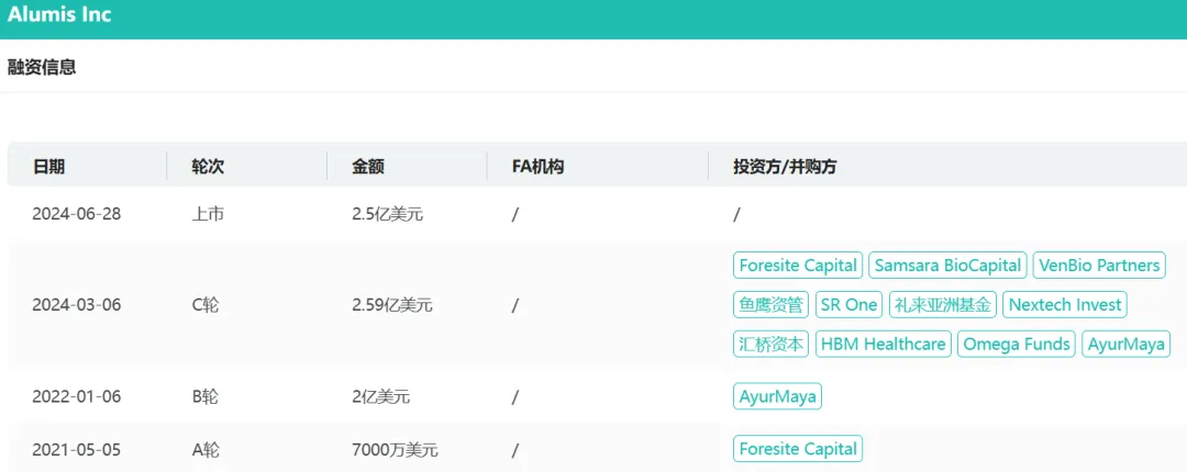 2021年5月,Alumis完成7000万美元A轮融资;2022年1月,完成2亿美元B轮融资;2024年3月,Alumis完成2.59亿美元C轮融资,创下2024年Q1私营biotech融资新高;2024年7月,Alumis完成2.5亿美元IPO。据披露,AlumisIPO之前Foresite Capital持股32.6%。