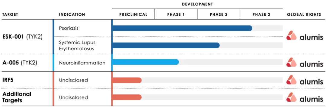 Alumis是一家精准免疫学公司(前称Esker Therapeutics),由Foresite Capital投资,利用由Foresite Labs提供支持的精确分析平台,以及在精准医学药物发现、开发和免疫学方面具有丰富经验的专家团队,以开发自身免疫性疾病药物。其核心管线TYK2抑制剂ESK-001于2021年3月引进自中国的海思科,首付款6000万美元+最高达1.2亿美元的里程碑付款。