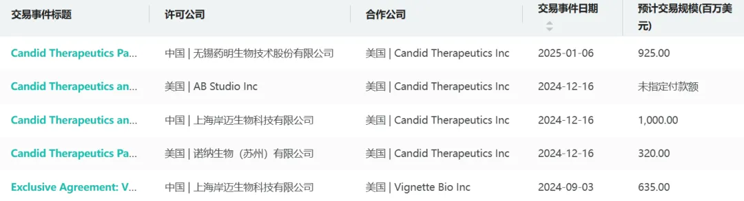 Studio(合作金额未披露)、岸迈生物(总计超10亿美元)。2025年1月6日,Candid宣布与药明生物就三特异性TCE达成合作协议,根据协议条款,药明生物有权获得总额高达9.25亿美元的预付款、里程碑以及特许权使用费。