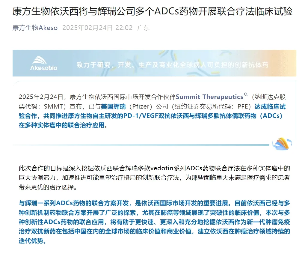 2月24日晚间,康方生物宣布,其合作伙伴Summit Therapeutics就依沃西与辉瑞达成了临床试验合作,共同推进该PD-1/VEGF双抗与ADCs药物在多种实体瘤中的联合治疗应用。