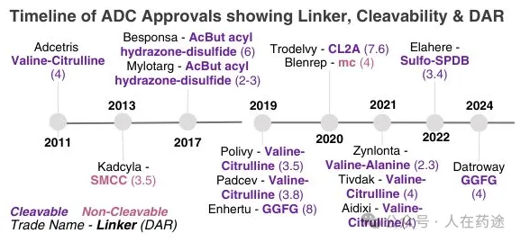 ADC批准的时间表,显示连接子、可切割性和DAR