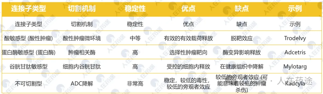 表格总结了不同连接子类型的属性,包括酸敏感型、蛋白酶敏感型、谷胱甘肽敏感型和不可切割型,并列出了每种连接子的优点、缺点和示例。