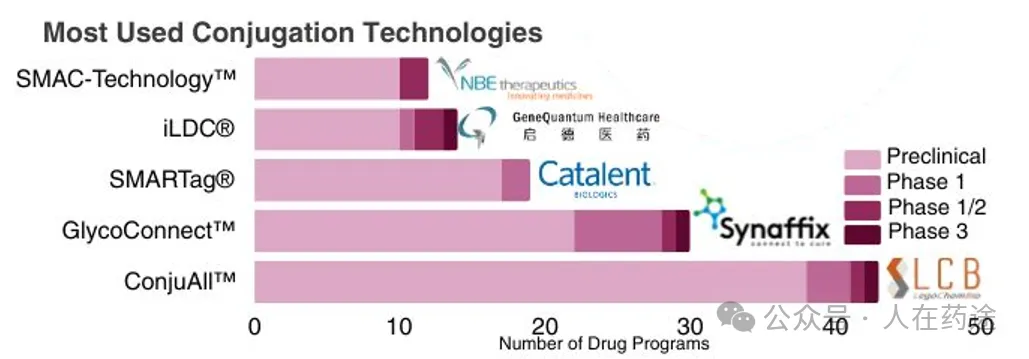 值得注意的是,59种具有β-葡糖苷酸连接子的ADC中有42种使用ConjuAll™,这是一种下一代平台技术,在之前的信息图中被标记为脱颖而出。ConjuAll™使用新型连接子化学与位点特异性酶偶联相结合,以赋予连接子稳定性和有效载荷释放。由大田生物科学公司开发的LigaChem Biosciences的ConjuAll™已成为26项交易的焦点,平均潜在交易总额为6.2亿美元,其中包括安进和武田等获得许可的公司。