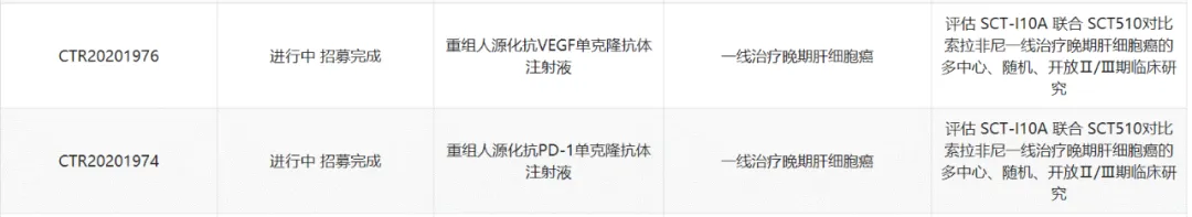 根据中国药物临床试验登记与信息公示平台信息,SCT-I10A联合SCT510正在进行两项一线治疗晚期肝细胞癌的多中心、随机、开放2/3期临床研究,以评估该联合疗法的安全性、耐受性,以及相比索拉非尼治疗受试者的总生存期(OS)和盲态独立中心阅片(BICR)依据RECISTv1.1评估的无进展生存期(PFS)。