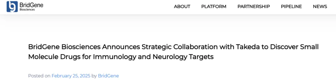 当地时间 2 月 25 日,BridGene Biosciences 宣布与武田达成战略合作和许可协议。根据合作条款,BridGene 将使用其化学蛋白质组学平台 IMTAC™ 来发现针对免疫学和神经学领域中具有挑战性靶点的新型小分子候选药物。双方将通过初期筛选和早期先导药物开发来共同推进这些项目。武田将拥有通过合作确定的所有潜在产品的开发和商业化的独家权利。