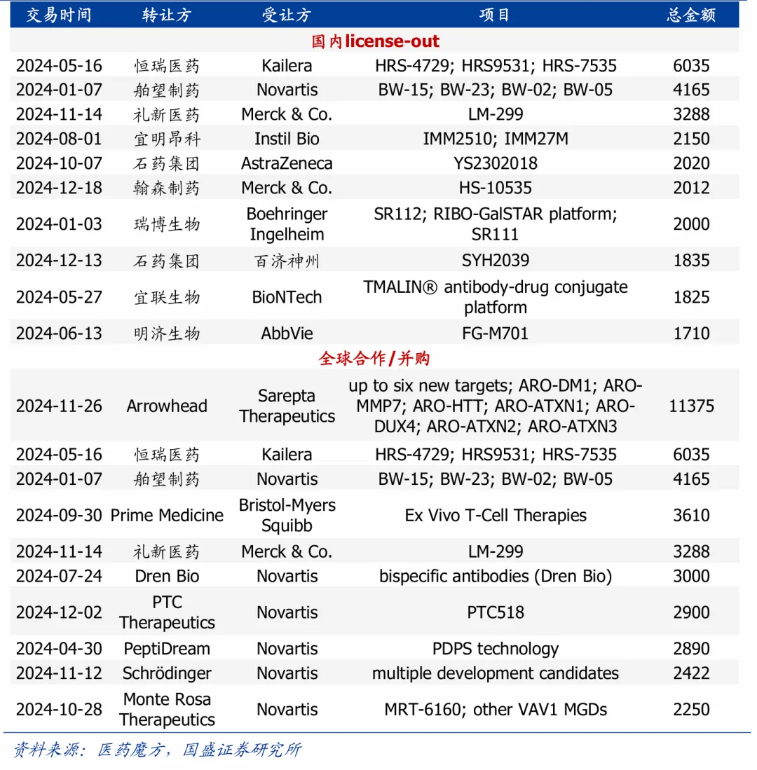 2024年国内与全球医药交易TOP10项目对比(单位:百万美元)
