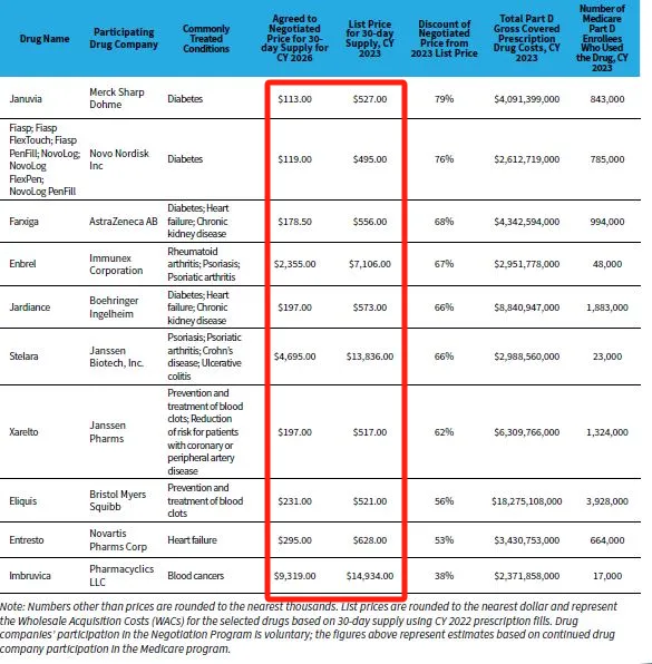 美国首批医保药物的最终协议价(图片来源:CMS官网)