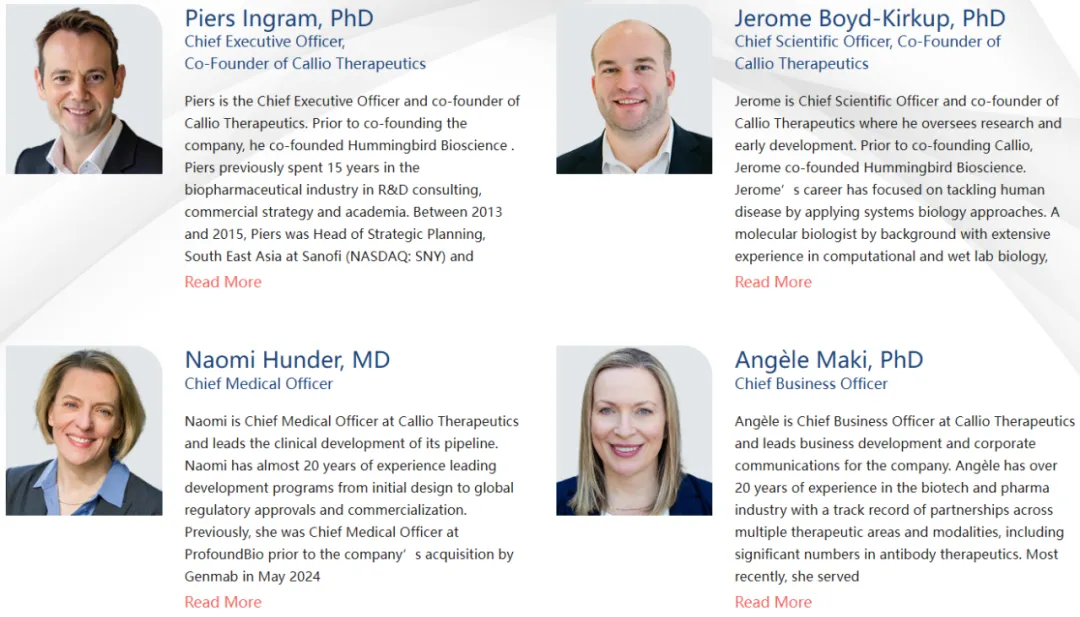 Callio Therapeutics的创始管理团队由来自领先的生物技术和生物制药公司的具有丰富经验的人员组成(如ProfoundBio、Silverback Therapeutics、SeaGen、Medarex、Hummingbird Bioscience和Genentech)。