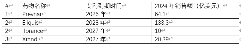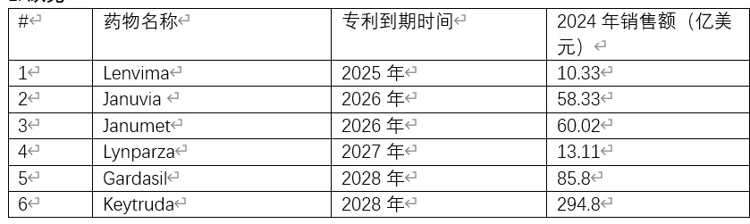 以上五种药物中最受关注的专利悬崖非重磅癌症疗法 Keytruda莫属,Keytruda是PD-1抑制剂,可阻断PD-1与其配体PD-L1和PD-L2之间的相互作用,释放PD-1信号通路介导的免疫反应抑制,从而激活可能影响肿瘤细胞和健康细胞的T淋巴细胞,增强人体免疫系统发现和消灭癌细胞的能力。默沙东2023年财报显示,Keytruda在2023年的销售额为250亿美元,成功登顶全球“药王”。2024的销售额超过 290 亿美元。然而,Keytruda 的关键专利将于 2028 年到期。为了支撑该药物的销售,默克公司正在准备开发Keytruda的皮下制剂。2024年11月,默克宣布了PD-1抗体Keytruda皮下给药制剂关键的3期MK-3475A-D77试验的阳性顶线结果。如果开发成功,该产品的推出有望延续产品生命周期。除了皮下注射 Keytruda,默克还依赖其成人肺动脉高压的首创治疗药物 Winrevair,2024年3月,该药获FDA批准,这是第一个针对肺动脉高压根本病因的治疗方法。据预测, 2029 年的销售额将达到 49 亿美元。