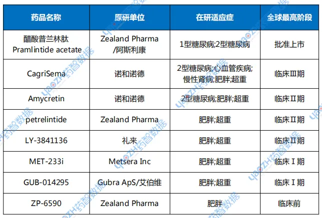 Zealand Pharma开发的Pramlintide是首个获批用于糖尿病管理的合成胰淀素类似物。目前,布局该靶点用于肥胖症治疗的药企还比较少,进展最快的是诺和诺德,其Amylin/GLP-1双重受体激动剂Amycretin和复方制剂CagriSem已进入临床后期。