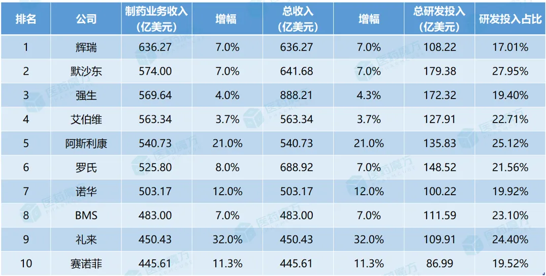 注:罗氏、阿斯利康、诺华、赛诺菲按固定汇率计算;按2024年平均汇率换算:1瑞士法郎=1.1388美元,1欧元=1.0847美元,1丹麦克朗=