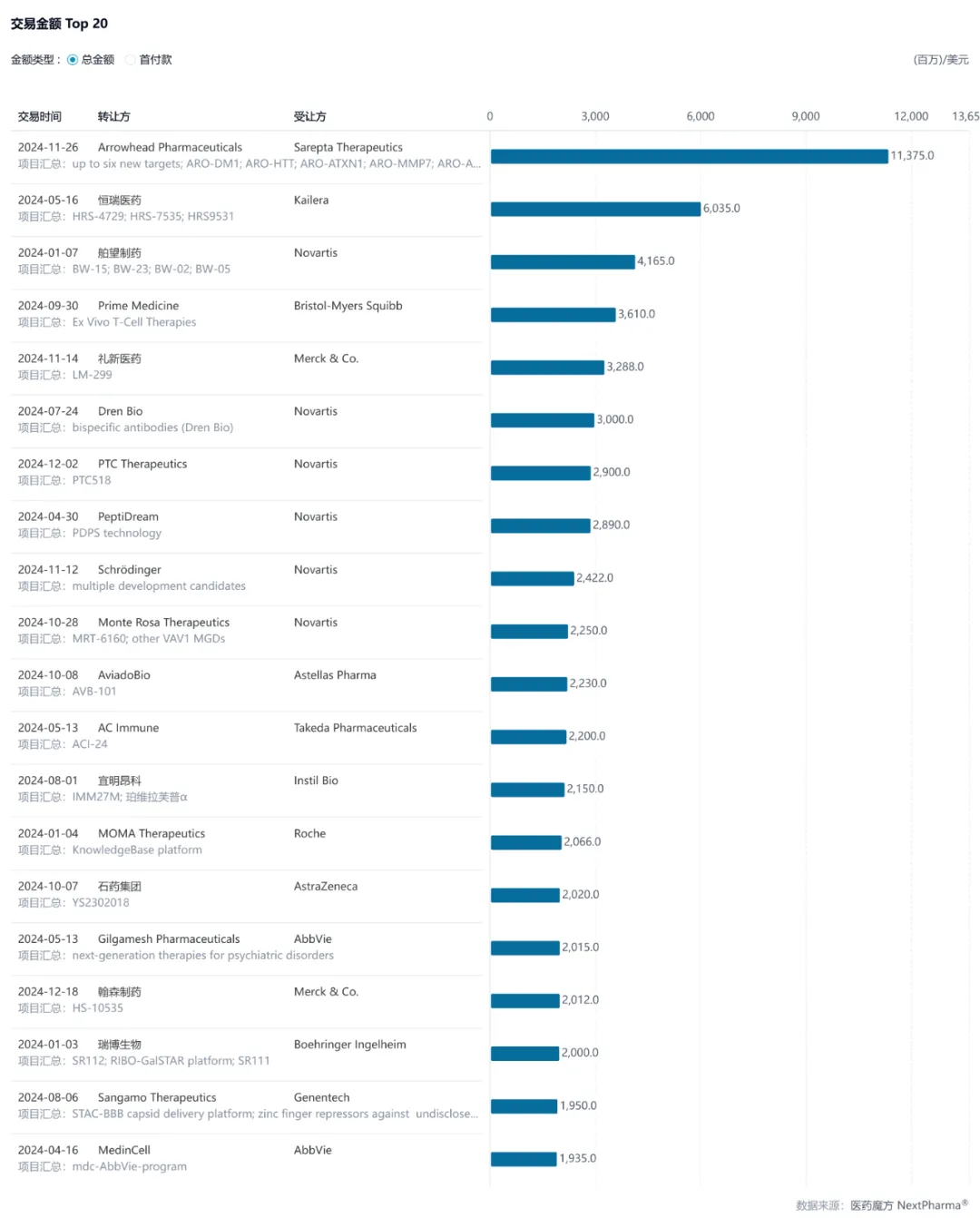 交易合作方面,与2023年相比,各大制药巨头出手也相对保守,并未出现如默沙东以220亿美元与第一三共ADC交易的大单,而是聚焦于小规模的策略性投资,例如默沙东与礼新和翰森分别就PD-1/VEGF双特异性抗体和口服小分子GLP-1药物达成的合作协议。诺华则表现的相对积极,在TOP20交易中占据了6个席位,其中最引人注目的是与舶望制药达成的价值41.65亿美元的合作,旨在共同开发多款心血管siRNA药物。