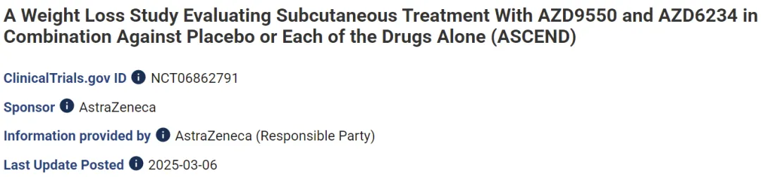 2025年3月6日,阿斯利康在Clinicaltrials.gov网站上注册了AZD9550+AZD6234联合治疗减重的2b期临床试验。