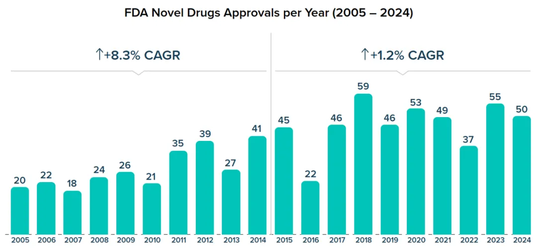 在过去十年(2015-2024年)中,FDA批准了462种新药,比上一个十年(2005-2014年)的273次批准增长了69%(图1)。然而在这十年间的后五年,FDA批准新药数量的增长率已大幅放缓。2005年至2014年间,批准的复合年增长率(CAGR)为8.3%,从2015年到2024年下降到仅1.2%。在过去十年中,平均每年批准46种药物,2016年和2022年出现了大幅下降。在2023年表现强劲之后,2024年的批准略有下降,但仍高于平均水平。