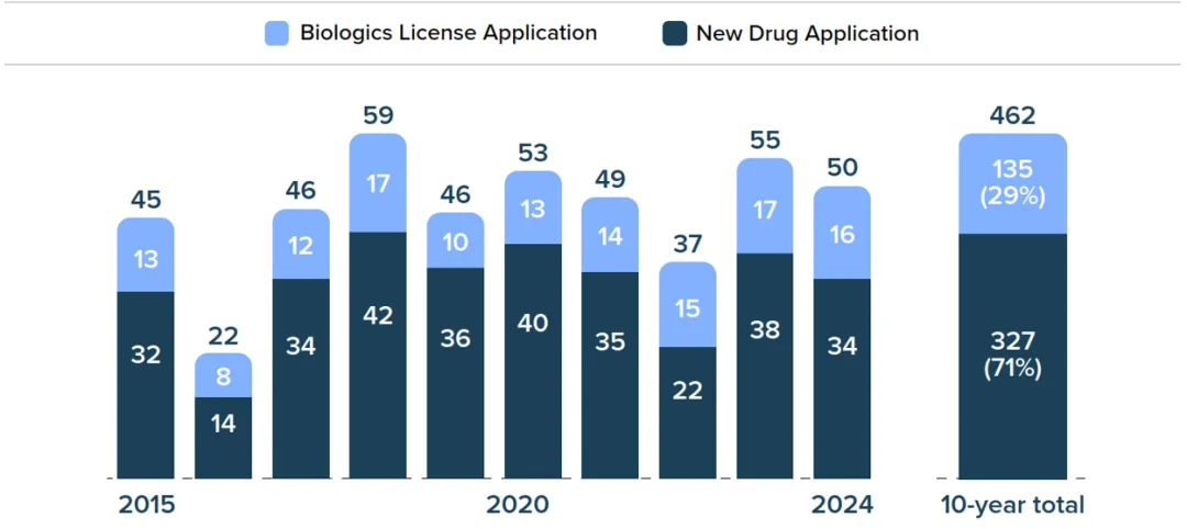 2015-2024年NDA和BLA批准数量对比图,来源:QYOBO