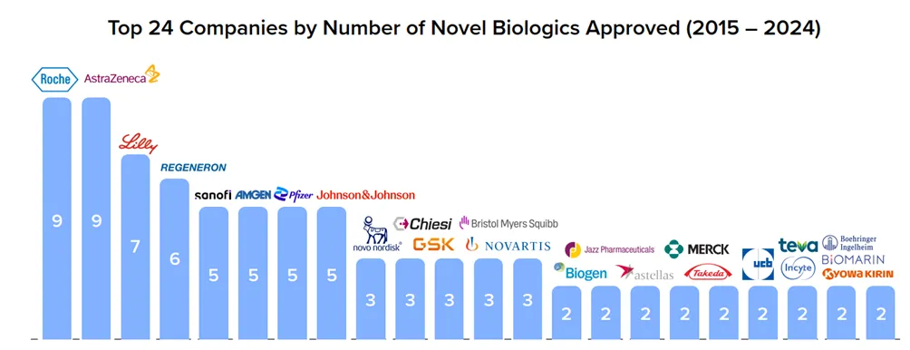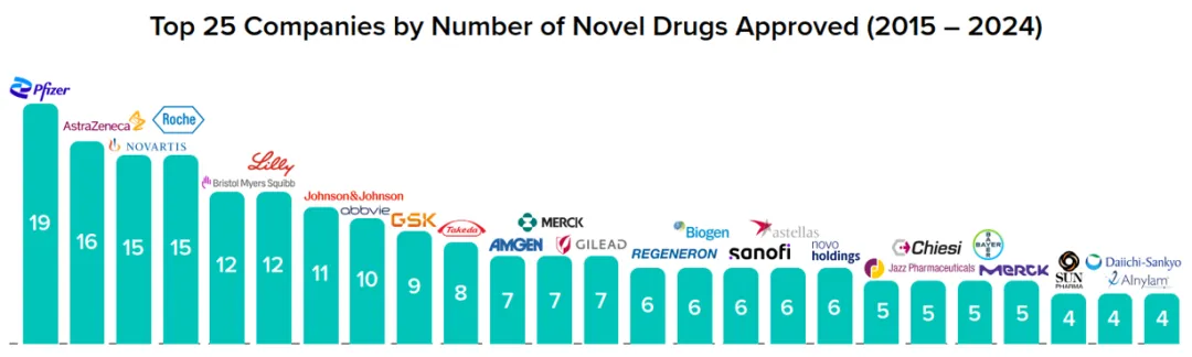 图4. 2015-2024年间新药BLA申请获批数公司排名,来源:QYOBO