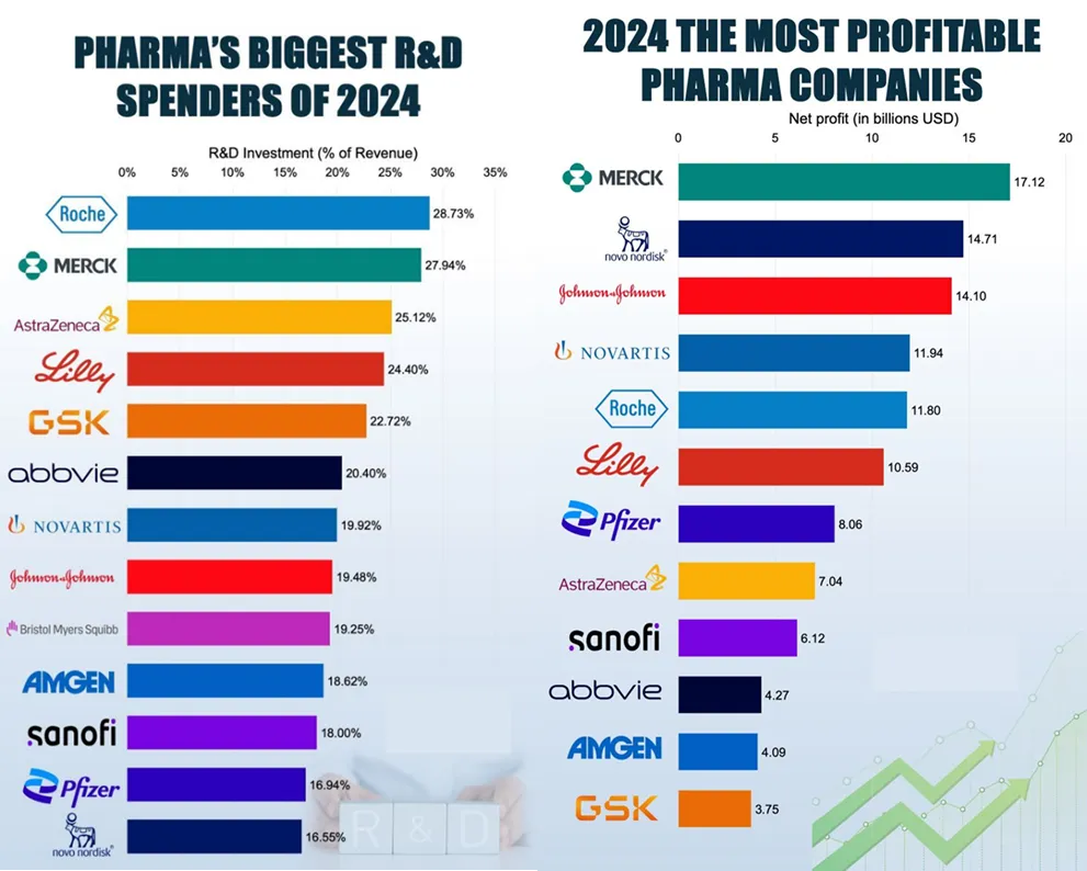 图7. 2024年制药巨头研发投入比例(左)及净利润(右)排名图,图片及数据来源:LinkedIn:joanna-sadowska-phd