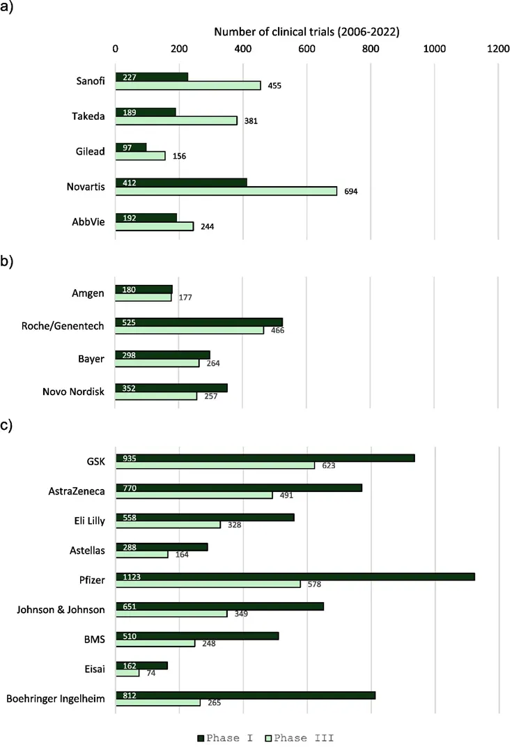 图8. 主要制药公司的临床试验(I 期和 III 期)数量(2006-2022 年)。