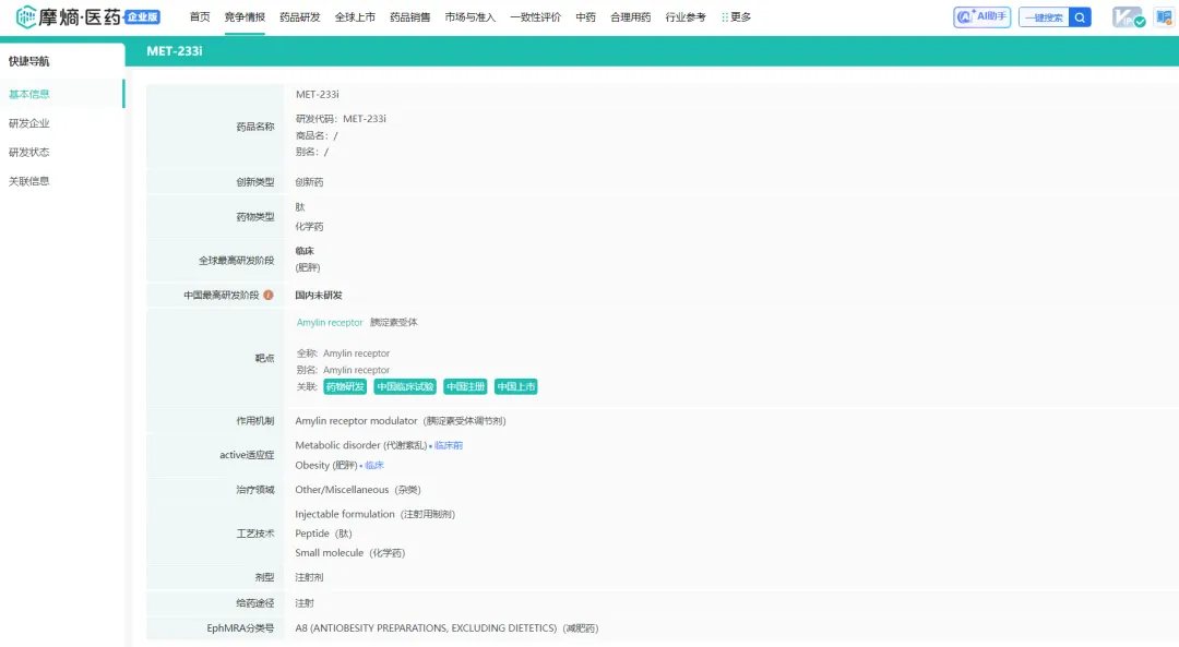 MET-233i是一种可皮下注射的超长效胰淀素类似物,具有低原纤维形成电位和与其他NuSH类似肽的混溶性,可作为单药使用,也可以与其他NuSH类似肽(包括MET-097i)形成混合制剂,主打“延长给药周期+增效”的双重卖点。MET-233i针对肥胖或超重患者进行单药治疗的临床试验1期研究的IND已获得FDA的批准,目前已在美国启动了这项试验,并计划在2025年年中报告初步数据。如果能在MET-233i的临床试验1期研究中建立足够的临床安全性证据,Metsera计划在美国启动MET-097i与MET-233i联合进行的临床试验,可能在2025年底报告初步数据。