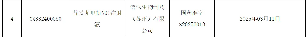 信达生物的替妥尤单抗N01注射液获批上市,用于治疗甲状腺眼病(TED )。