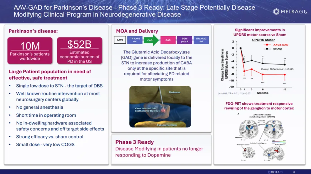 MeiraGTx的AAV-GAD项目是一种基于腺相关病毒(AAV)的基因疗法,通过在大脑中局部产生γ-氨基丁酸(GABA)来重塑功能失调的大脑回路,从而改善帕金森病患者的症状。此前,该疗法在一项小规模临床试验中已显示出积极结果,患者在统一帕金森病评分量表和生活质量指标方面均有显著改善。