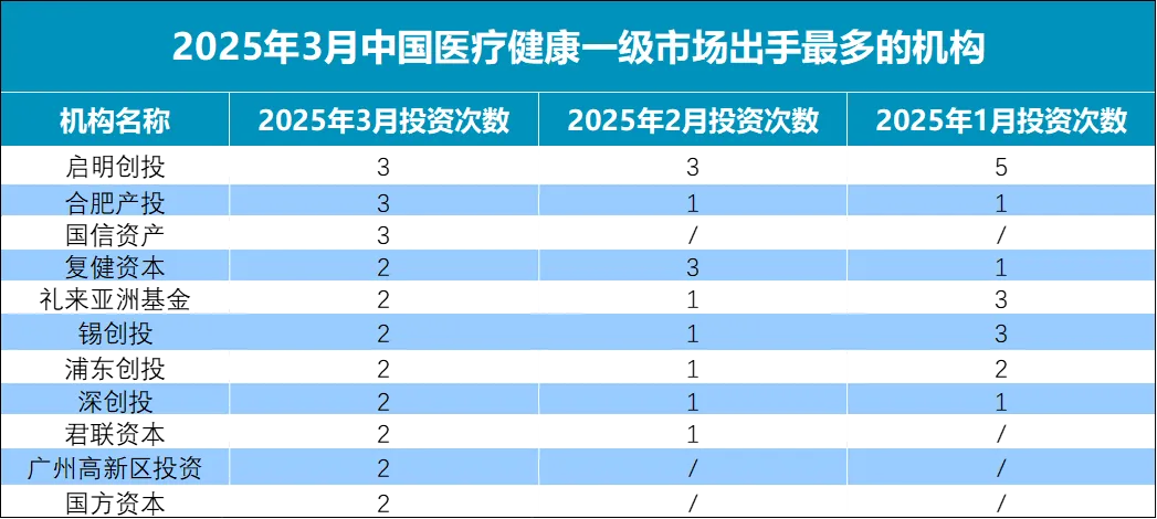 在这些活跃的机构里,启明创投、合肥产投、国信资产、复健资本、礼来亚洲基金、锡创投、浦东创投、深创投、君联资本、广州高新区投资、国方资本在3月份出手次数最多。其中,启明创投、合肥产投、复健资本、礼来亚洲基金、锡创投、浦东创投、深创投在今年前三个月更是均有出手。