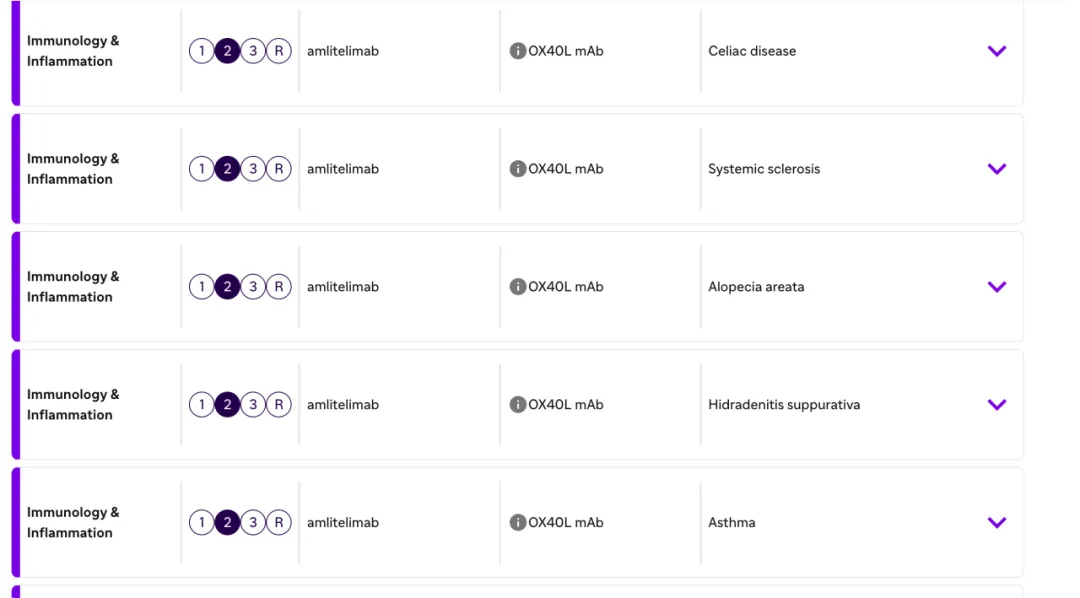 Amlitelimab也是赛诺菲高价BD的管线。它原研于Kymab,该biotech在2021年1月被赛诺菲高价收购,11亿美元预付款,3.5亿美元里程碑付款。该收购主要就是为了拿到KY1005的全球权益,该管线后来叫Amlitelimab。赛诺菲对它寄予厚望,给出了50亿欧元的销售峰值预测。要达到这么多欧元,自然需要多项适应症做支撑。目前它开的适应症如下图所示: