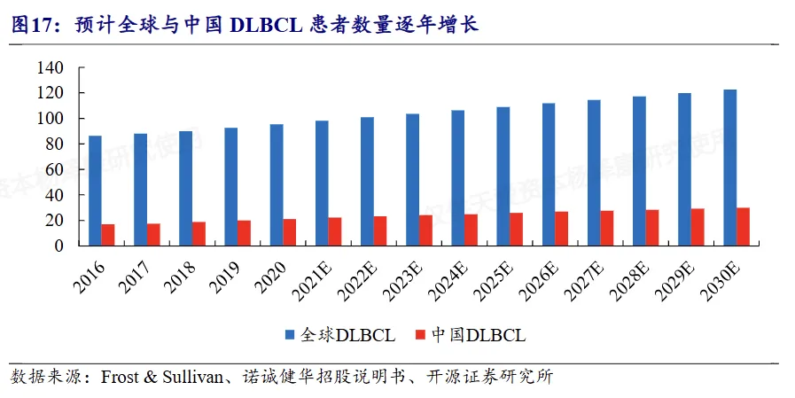经历了层层区分,DLBCL依旧在整体NHL有着很大的比例(全球/中国DLBCL存量患者占NHL总数的37.1%/41.1%),据弗若沙利文统计,2020年DLBCL存量患者人数全球/中国分别为95.4/21.1万人。